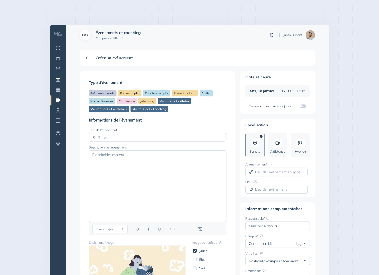 Pour accompagner la prise en main, une section Conseils contextuelle guide les écoles directement dans le formulaire de création, sans documentation externe nécessaire. Toutes les interactions sont pensées pour que chaque profil trouve ce dont il a besoin.